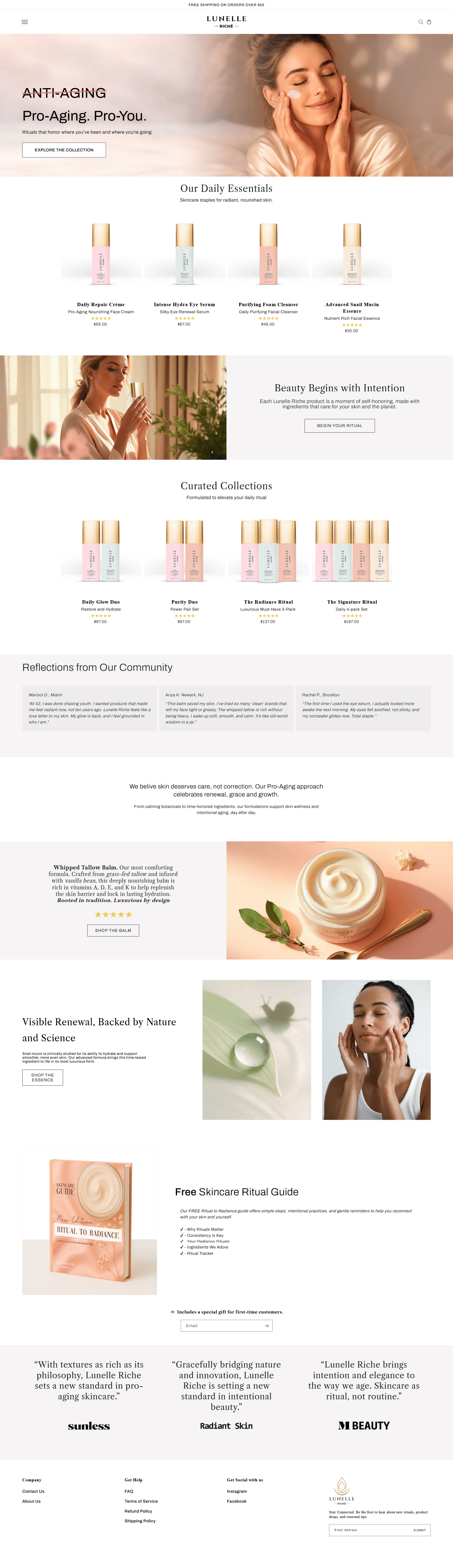 Luxury pro-aging skincare brand with editorial design and curated collections.